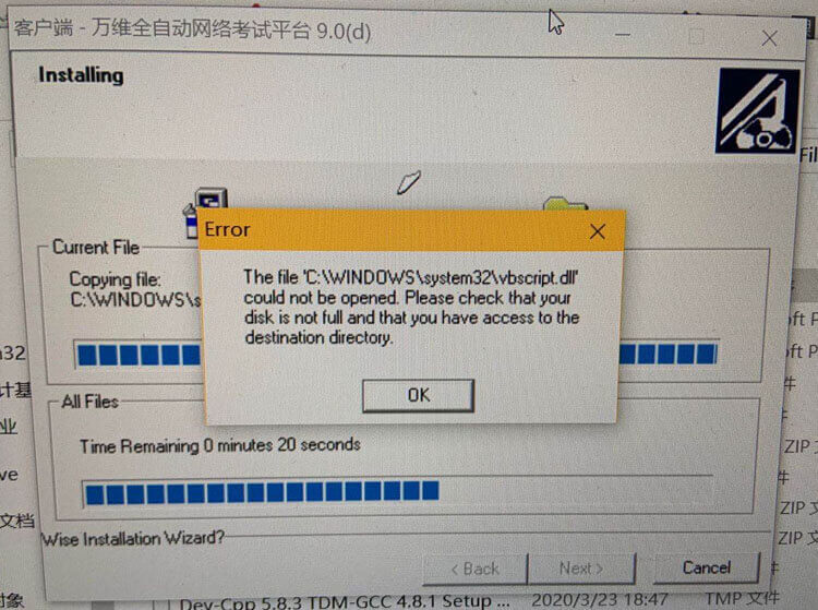 安装提示“The file 'C:WINDOWSsystem32vbscript.dll' could not be opened. Please check that your disk is not full and that you have access to the destination directory.”