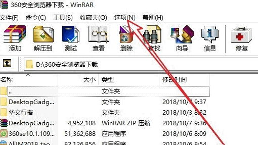2、WinRAR软件主界面,点击顶部菜单栏上的选项;