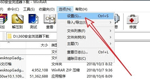 3、WinRAR展开的下拉菜单项中,选择设置;