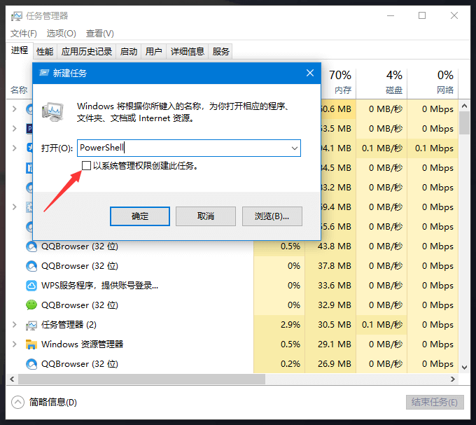 按 Ctrl + Shift + Esc 组合键,可以快速打开任务管理器,默认情况下只会显示简略信息版的任务管理器,点击详细信息,再点击文件菜单,在打开的菜单项中,选择运行新任务,打开的新建任务对话框,输入PowerShell命令,然后勾选以管理员权限创建此任务,接着点击确认以打开带有管理员权限的PowerShell提示框
