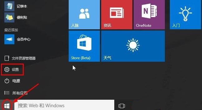 点击左下角的开始菜单,然后点击设置按钮。