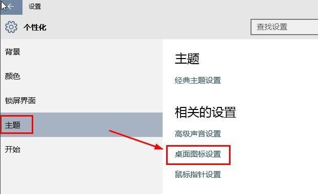 4、个性化设置窗口中,点击左侧侧主题,然后右侧点击相关的设置下桌面图标设置;
