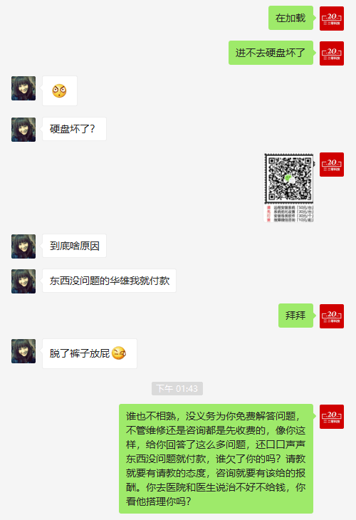 最近有一些朋友,一加微信就火急火燎的问问题、问故障、问如何解决,而让其支付10元咨询费时,提出要求先修好再支付,并出言不讳。