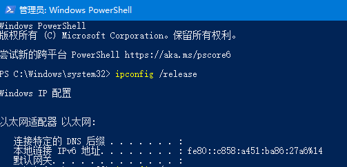 2、管理员:Windows PowerShell窗口中,在命令行中输入并回车执行 ipconfig /release 命令;