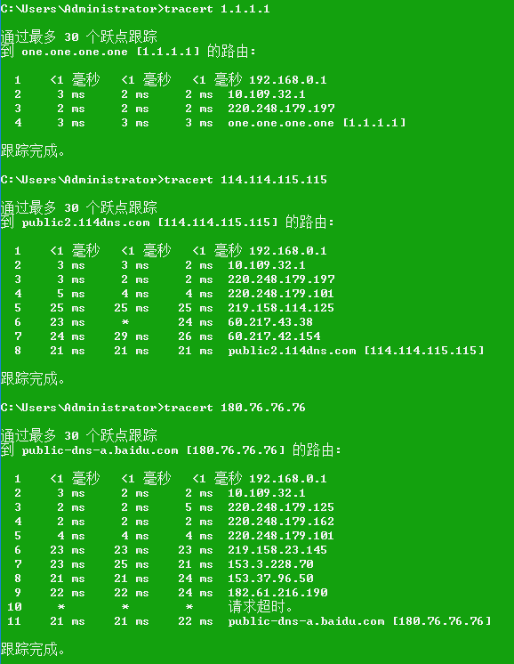 在这里我们可以看到达到目标(不算终点)1.1.1.1(ttl=252)经过了3个路由、114.114.115.115经过了7个路由、180.76.76.76(ttl=55)经过了10个路由。