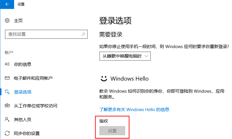 4、最后,点击Windows Hello选项,即可进行Win10家庭版指纹设置;