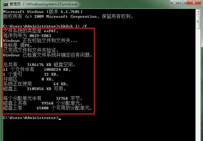 4、输入命令后,按Enter(回车)键,自动执行命令。耐心等待U盘修复完毕就可以了,在chkdsk修复U盘的结果中,我们可以看到很多相关信息;