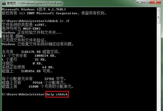 i是磁盘的驱动器号,也就是你要修复的U盘驱动器的符号,/f是磁盘修复命令