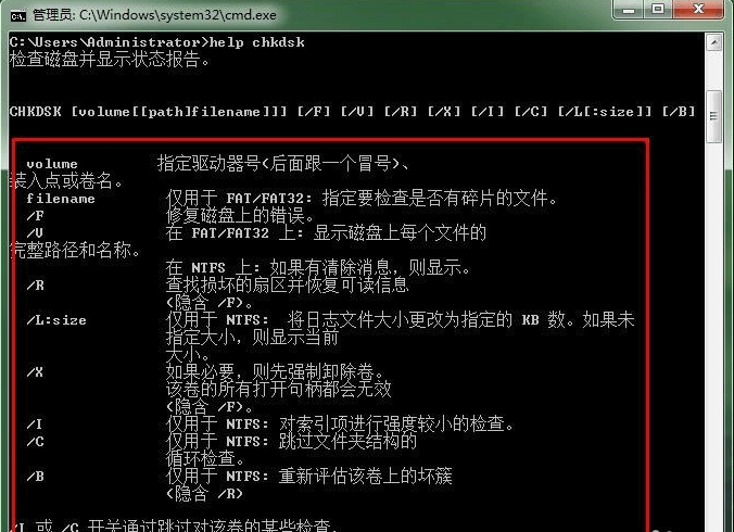 5、输入 help chkdsk ,可以查看chkdsk帮助;