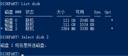 可以看到磁盘有三个,编号从0-2,我们要进入硬盘2,就输入Select disk 2,然后按回车。