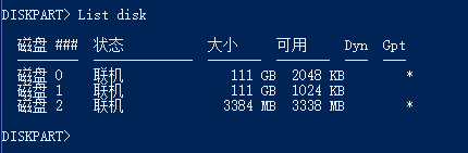 输入List disk,查看磁盘列表。