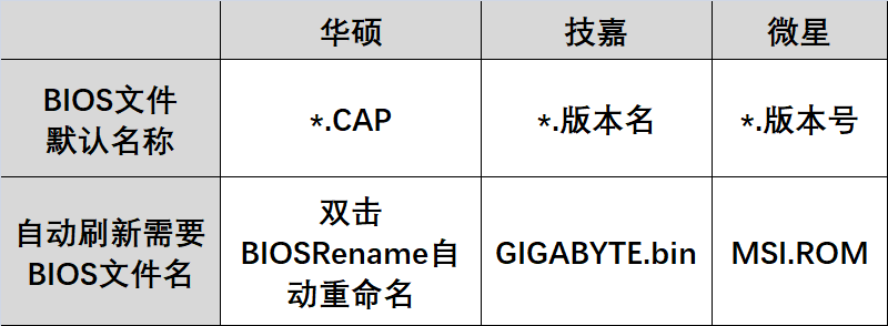 下载主板最新BIOS,把其中的文件都解压到U盘根目录,有些品牌需要自行给BIOS文件改名,你说啥?不认识BIOS文件?那就找其中容量最大的那个,准没错。至于咋改名,大家看下面的表格就知道啦。要注意,华硕BIOS必须保证将其中的文件都放在一个目录下才能自动改名成功。