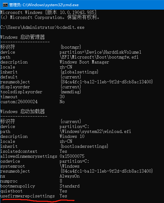 输入命令时注意中间的空格“bcdedit空格/deletevalue空格{default}空格usefirmwarepcisettings回车”,显示操作成功完成后,重启电脑即可。