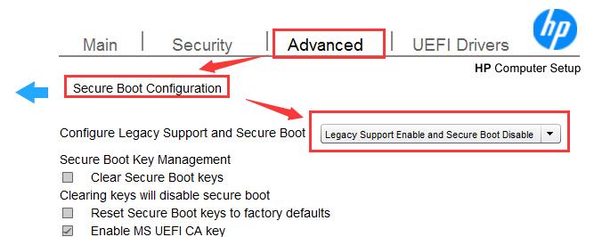 开机F10进BIOS,如上设置“Advanced”-"Configure Legacy Support and Secure Boot"-"Legacy Support Enable and Secure Boot Disable"(开启传统模式和关闭安全引导),按F10保存退出。