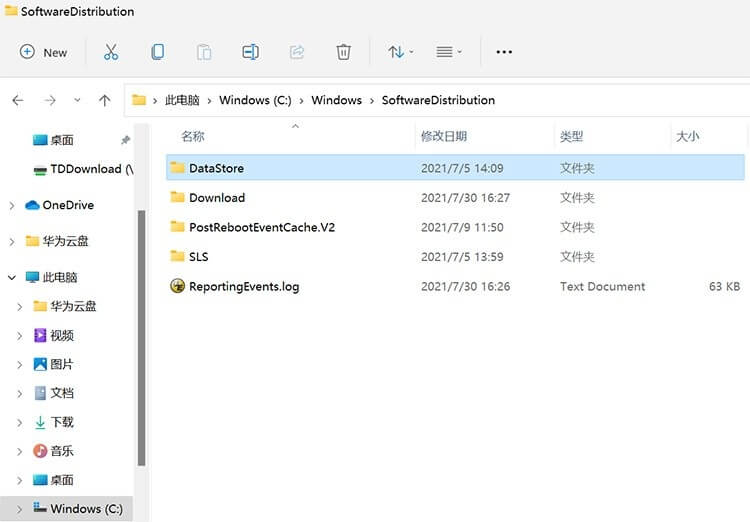 3、接着打开以下路径,C - Windows - SoftwareDistribution文件夹,删除DataStore和Download文件夹;