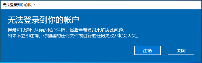 删除NTUSER.DAT后,进入桌面会提示“无法登录到你的帐户”,点注销也会一样弹,点关闭。