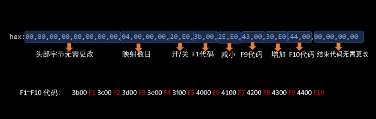 将其保存为1.reg,然后双击导入注册表。如果需要更改快键键,只需按照下图中的说明更改1.reg中对应的代码并重新导入即可(删除"Scancode Map"=hex:之后的代码则恢复按键的原有功能)。