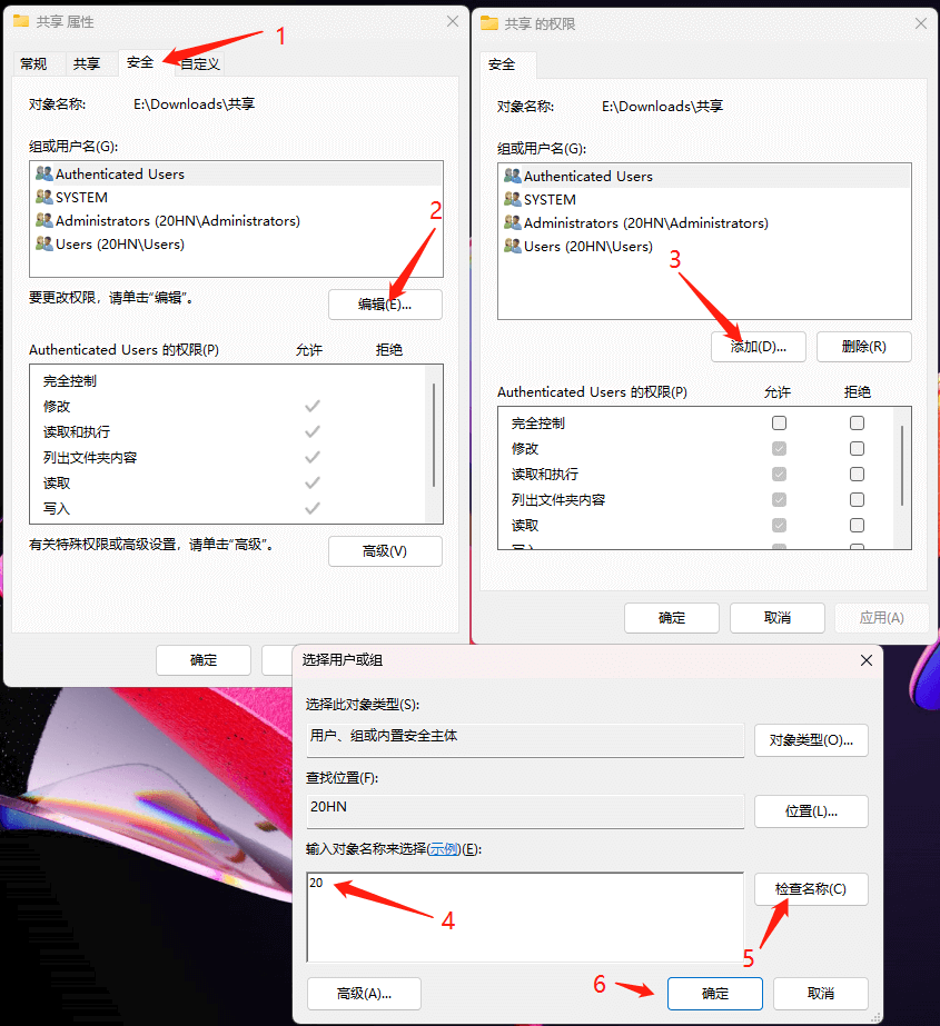 2、右键需要共享的文件夹→安全→编辑;点击添加→输入新建的用户名“20”→检查名称→确定;选中用户名“20”→勾选允许的权限→确定;