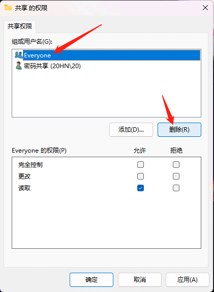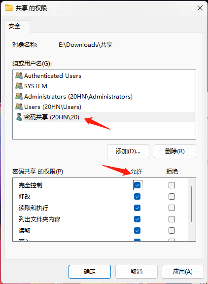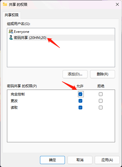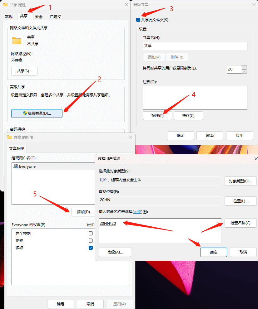 3、共享→高级共享;勾选“共享此文件夹”→权限;输入新建的用户名“20”→检查名称→确定;选择“20”→勾选允许的权限→确定;选择已有的用户名“Everyone”→删除;