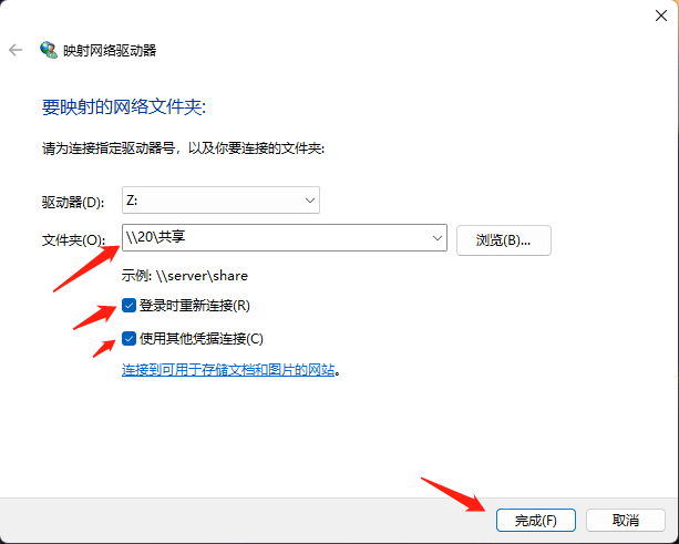 2、输入“\电脑名称\共享文件夹名称”勾选“登录时重新连接”和使用其他凭据连接“,点完成;