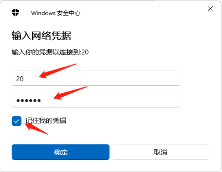 3、在弹出的窗口输入之前设的用户名和密码,并勾选“记住我的凭据”确定即可。
