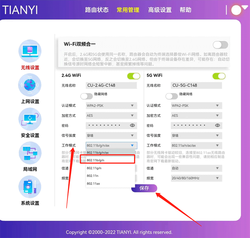 此款路由器没有兼容模式的选项,只有把工作模式改成802.11b/g/n,只需要更改2.4G WIFI,5G WIFI不去动,保存即可解决老笔记本搜不到路由器信号的问题。