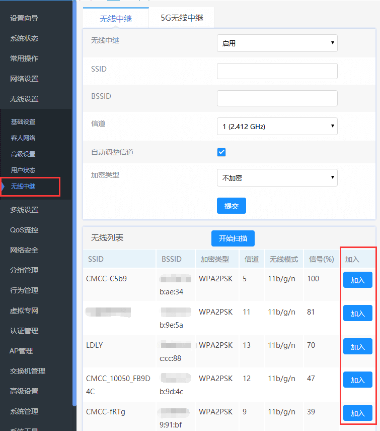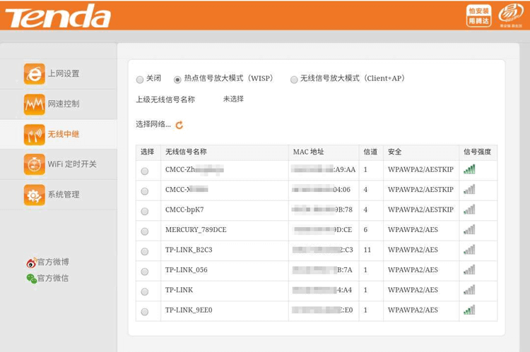 3、首选模式“WISP”,如果没有选择可忽略,不同路由器的界面会不同,但是大体一样。我们选中其中一个知道密码的信号或手机热点加入即可,点击一下会让你输入密码,保存后路由器可能会自动重启,等待几分钟后去电脑上打开网页验证是否能上网。