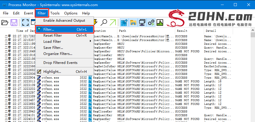 一、下载并打开监测注册表工具Process Monitor;(https://docs.microsoft.com/zh-cn/sysinternals/downloads/procmon)