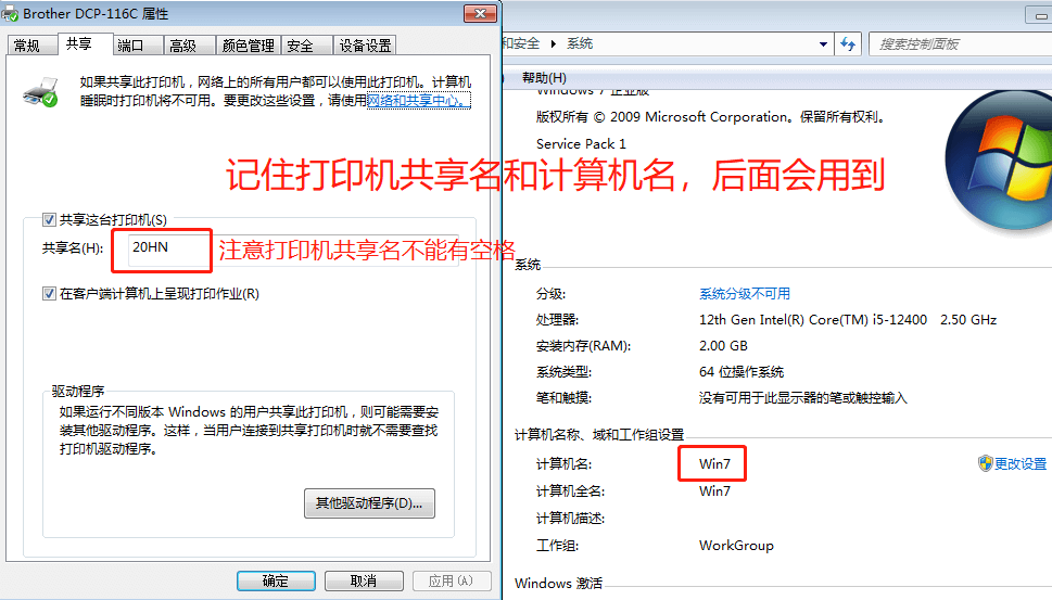 记信打印机共享名和计算机名,后面会用到。