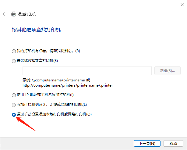 3,在弹出的“添加打印机”窗口中,选择“通过手动设置添加本地打印机或网络打印机”,然后“下一页”。