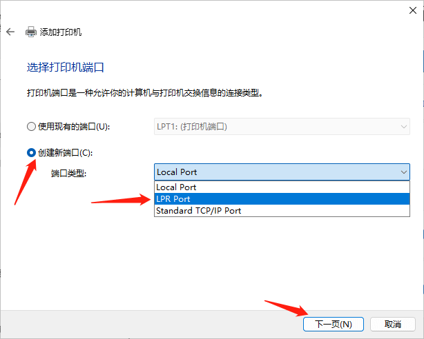 4,选择“创建新端口”,然后从下拉菜单中选择“LPR Port”,点击“下一页”。
