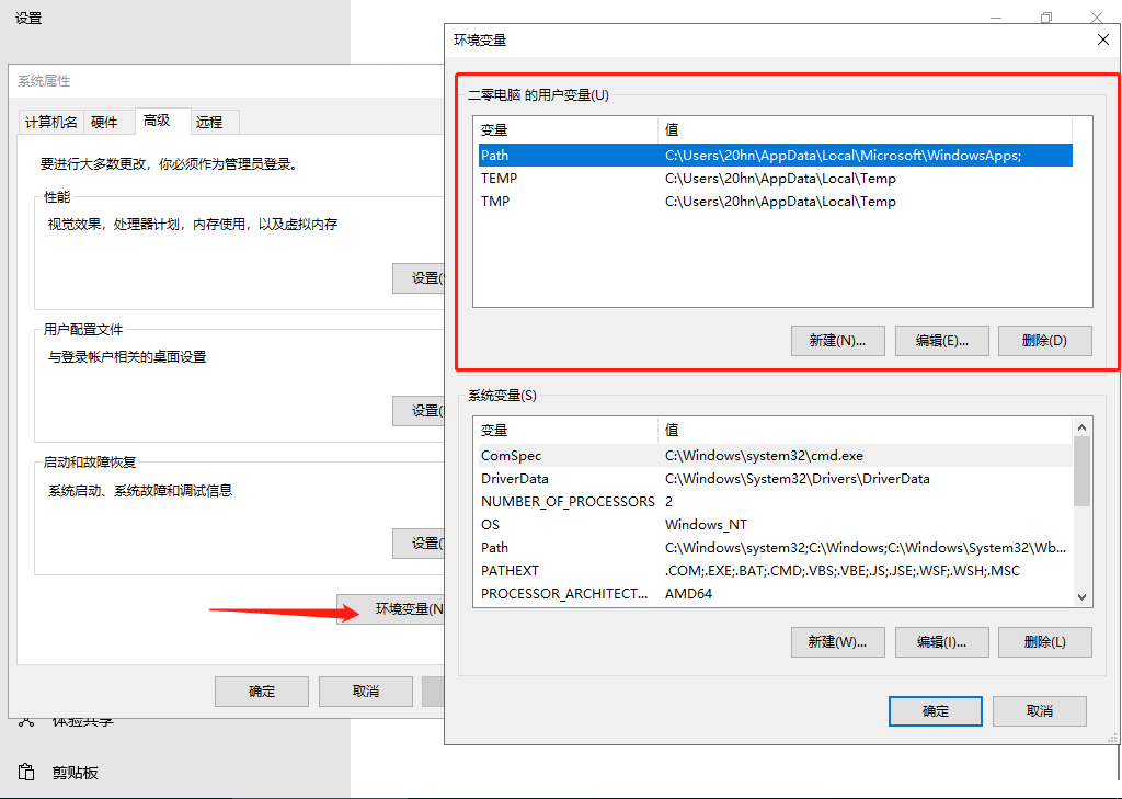 4、注销“administrator”帐户,切换到中文帐户,修改系统变量(如已不是中文更改可跳过此步),右键此电脑-选择属性-高级系统设置-环境变量-将用户变量中的所有中文用户名修改为英文用户名(可以直接双击打开,确保全部修改了),修改完成后点击两次确定完成这一步。