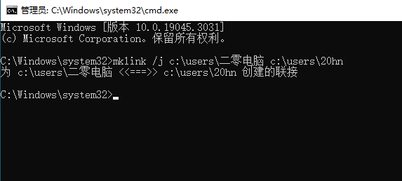 6、以管理员身份打开cmd,输入命令“mklink /j C:\Users\DNPU电脑 C:\Users\20hn”;注意把用户名改成你所修改的,如果提示错误,可以给中文用户名引号,如<mklink /j "C:\Users\DNPU电脑" C:\Users\20hn>。