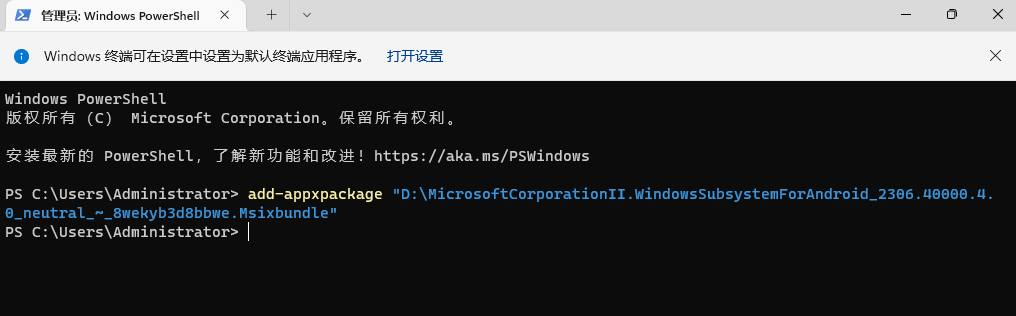 # 安装命令如下: Add-AppxPackage 鼠标点右键会自动粘贴安装包文件路径 # 看起来大概是这样的 (示例,请确保你的路径正确): Add-AppxPackage "D:\MicrosoftCorporationII.WindowsSubsystemForAndroid_2306.40000.4.0_neutral_~_8wekyb3d8bbwe.msixbundle" # 然后回车开始进行安装 # 如提示错误,请下载这三个安装包,右键安装,再执行上方安装命令 Microsoft.UI.Xaml.2.8_8.2306.22001.0_x64__8wekyb3d8bbwe.appx Microsoft.VCLibs.140.00.UWPDesktop_14.0.32530.0_x64__8wekyb3d8bbwe.appx Microsoft.VCLibs.140.00_14.0.32530.0_x64__8wekyb3d8bbwe.appx