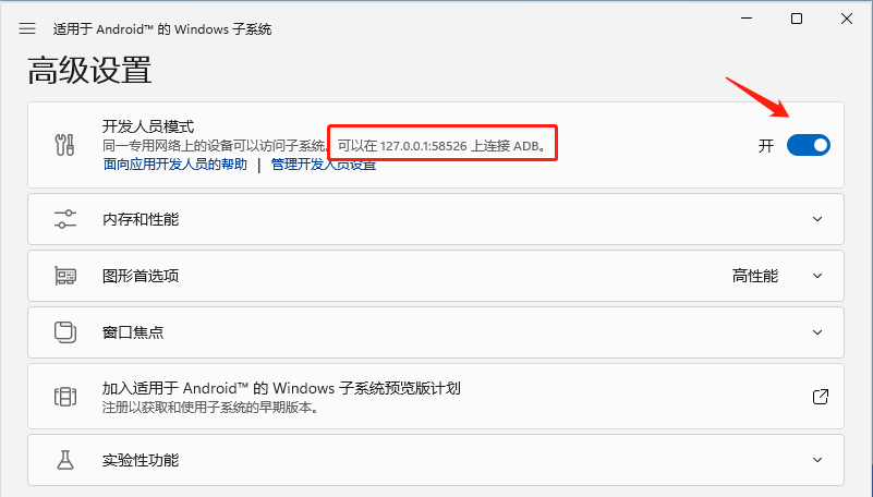 1.在安卓子系统高级设置页面,打开“开发人员模式”,记下IP地址和端口号,如127.0.0.1:58526