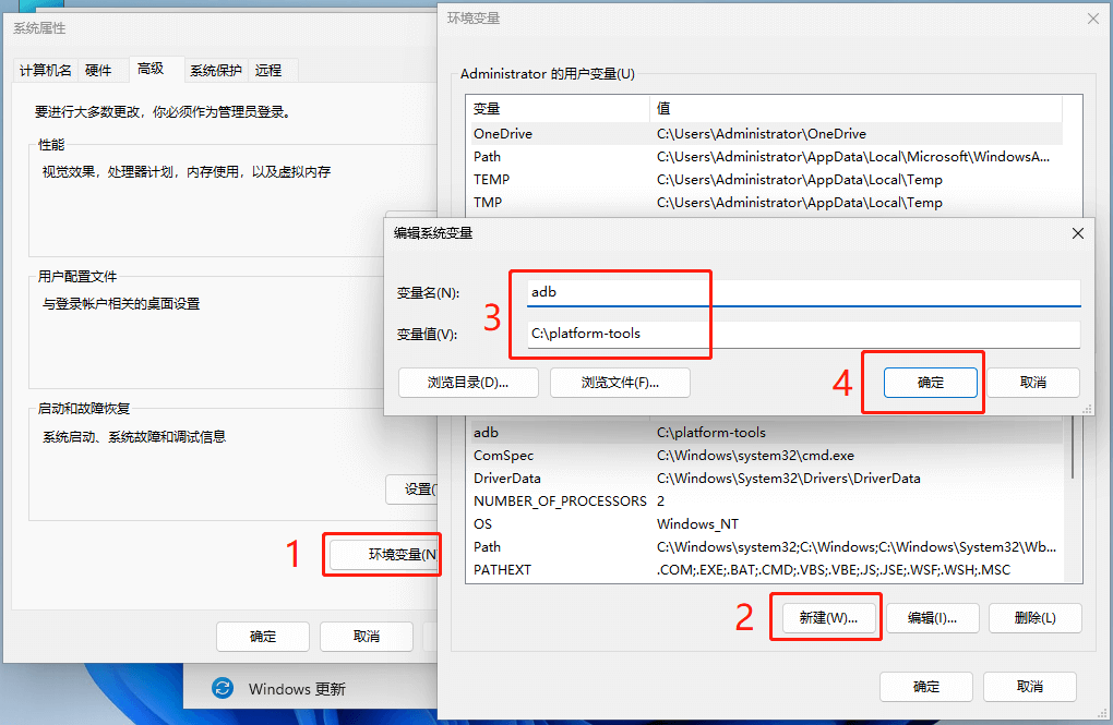 添加环境变量:右键点击「此电脑」›「属性」›「高级系统设置」›「高级」,如下图。点击「环境变量」然后「新建」,在弹出的对话框里,填入变量名:adb,变量值:C:\platform-tools,之后点确认。