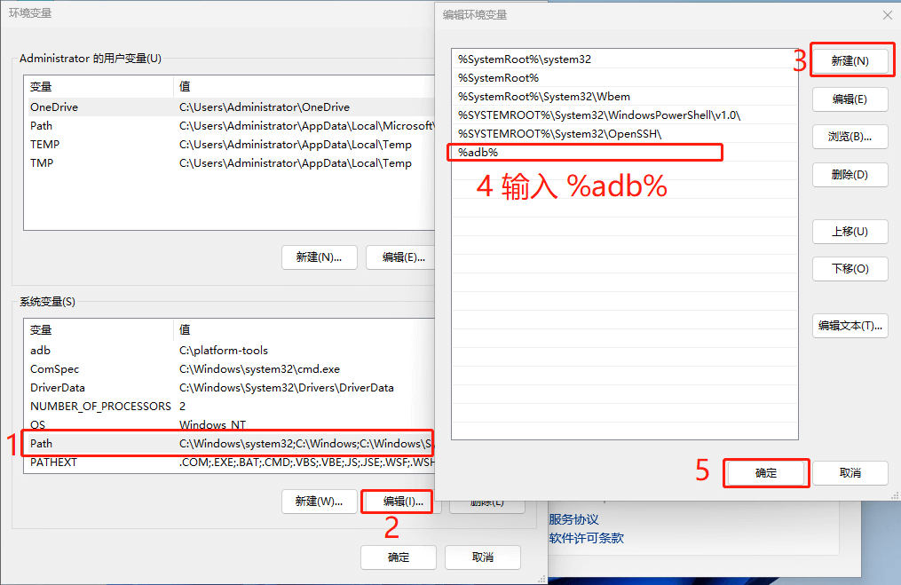 添加Path变量:在刚才的“系统变量”列表里找到一个名为 Path 的项目,然后点「编辑」› 「新建」,在新建的项目里输入 %adb% (前后无空格),然后点确定保存。
