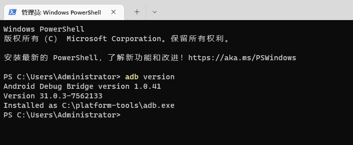 测试环境变量是否正确:打开“Windows 终端”或"cmd"命令行,输入“adb version”命令并回车,如果环境变量配置正确,那么就会显示出adb的版本号。