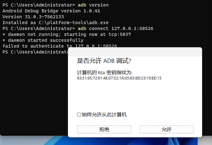# 第 1 步:连接 WSA # 其中 127.0.0.1:58526 是刚才在 WSA 设置项中看到的 IP adb connect 127.0.0.1:58526 # 勾上“始终允许从此计算机”,点“允许” # 第 2 步:安装 APK # 连接成功之后,就能用下面命令来安装 APK 了 adb install 你的APK文件完整路径 # 注意 .apk 的路径最好无中文且无空格,否则需要用英文双引号包裹。 # 你可在资源管理器上右键点击 apk 文件选「复制文件地址」获取完整路径 #下面是例子: adb install D:\weixin.apk adb install "D:\安卓\应用市场.apk" adb install "D:\安卓\西瓜视频-v6.8.8-v7a.apk" adb install "D:\安卓\阅读-3.22.080322-All.apk" # 最后按下回车即可安装 # 安装完成后,在 Windows 开始菜单的“所有应用”里就能找到你安装的 Android 应用