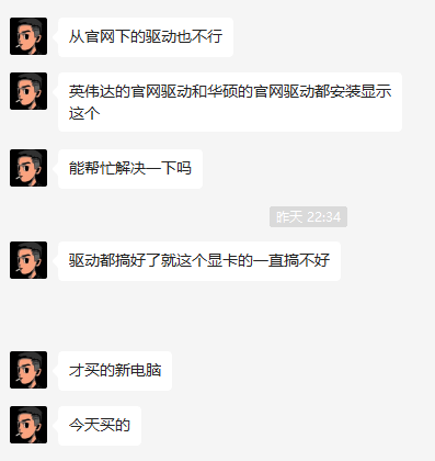 新电脑不应该出现这样的情况,只要不是奸商,硬件就没有问题,直接帮客户重装原版系统,开机后,显卡驱动自动安装好。