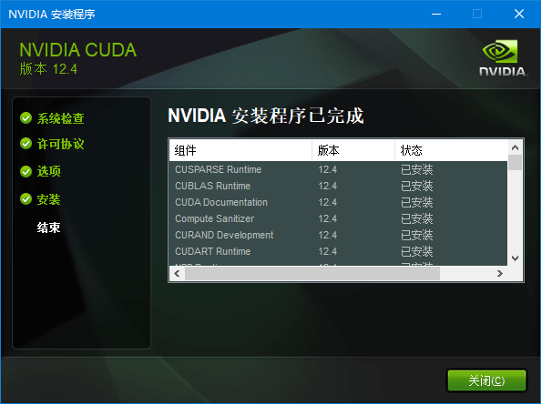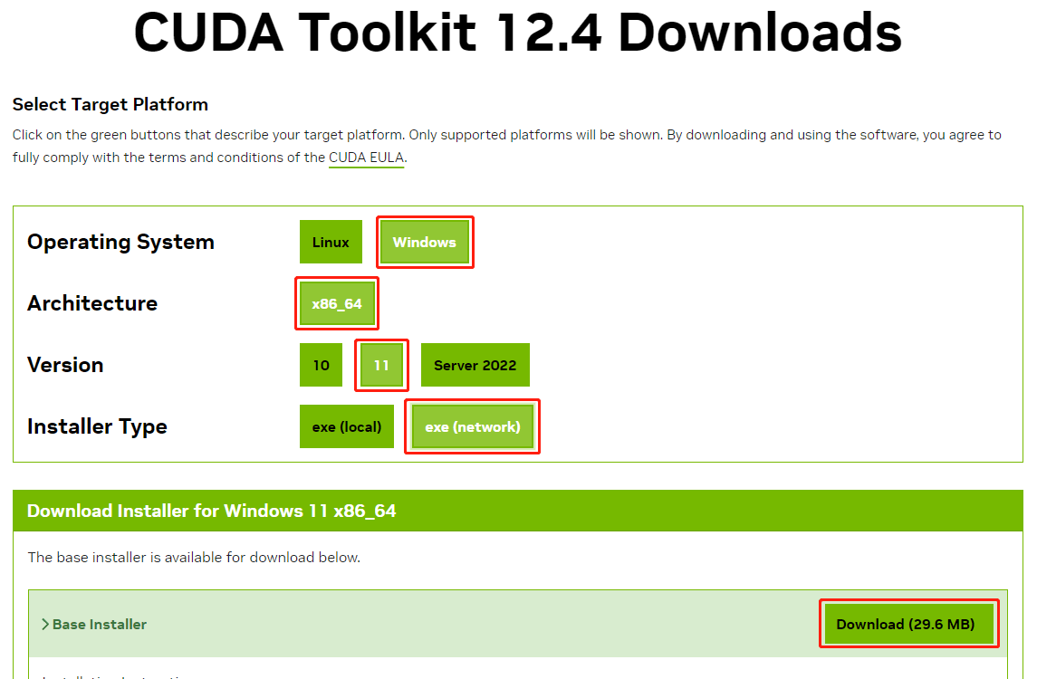 下载与操作系统对应的NVIDIA CUDA network版本,双击cuda_12.4.0_windows_network.exe安装。