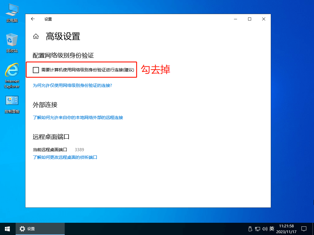 把“要求设备使用网络级别身份验证连接(推荐)”的勾去掉,不去掉会出现下面的错误。