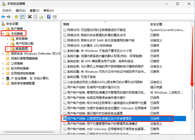 左侧选择:本地策略 → 安全选项,在右侧找到“用户账户控制:以管理员批准模式运行所有管理员”,双击打开属性界面;