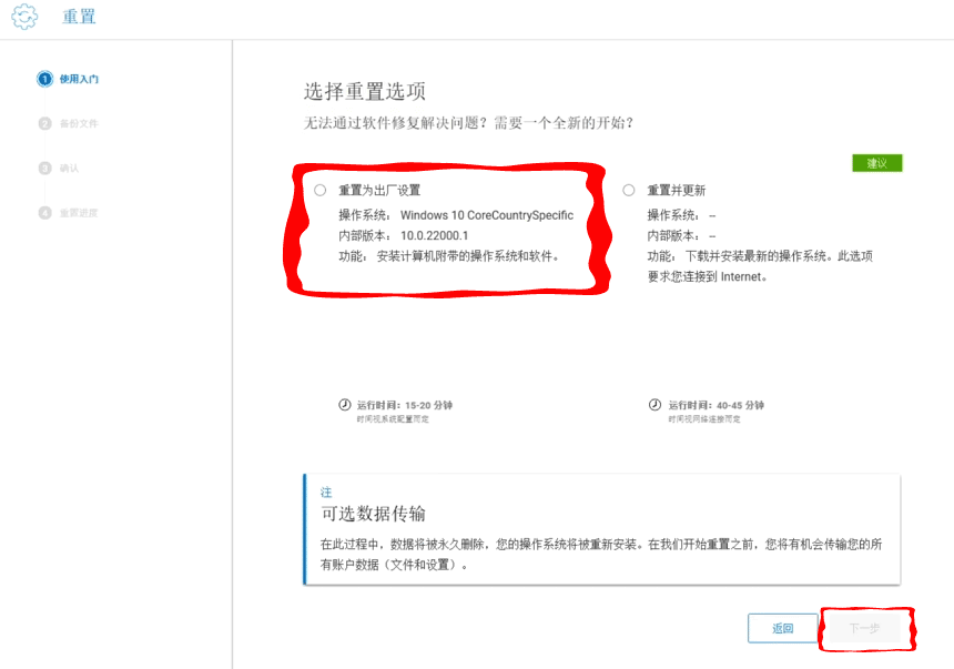五,选择“重置为出厂设置”,点下一步;(如果选“重置并更新”网速不快时间会很久,还需要自行安装驱动)