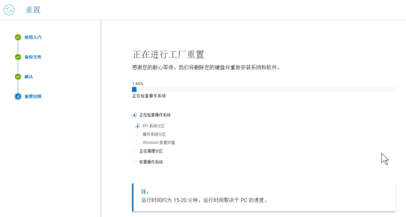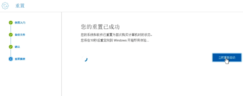 八,重置成功后,会自动重启电脑,恢复到刚买回来第一次开机的状态,按引导登录即可。