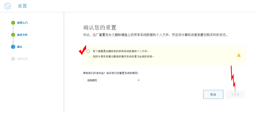 七,确认您的重置,勾选“我了解重置会删除我的所有系统数据和个人文件”,点下一步;