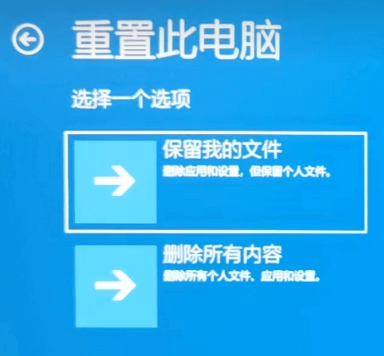 “保留我的文件”或“删除所有内容”;
