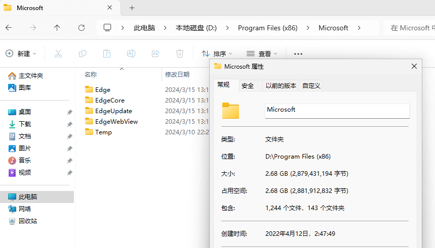 其它软件转移也是同样的方法方式,如Edge浏览器,位置在"C:\Program Files (x86)\Microsoft"目录,只需要在D盘创建一个“Program Files (x86)”的文件夹,在安全模式下,把“Microsoft”文件夹,剪切到"D:\Program Files (x86)\"下面,然后用命令提示符创建联接。