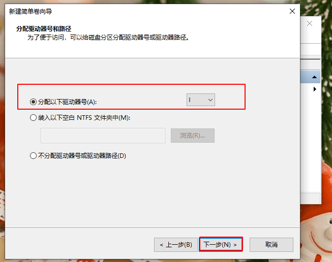 8、给新分区的盘,分配一个驱动器号,要是未使用的;