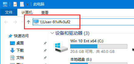 查看下共享电脑的计算机名或IP地址,如“USER-91VLFV3UF2”,打开此电脑,在地址栏里输入“USER-91VLFV3UF2”或“192.168.1.171”即可。